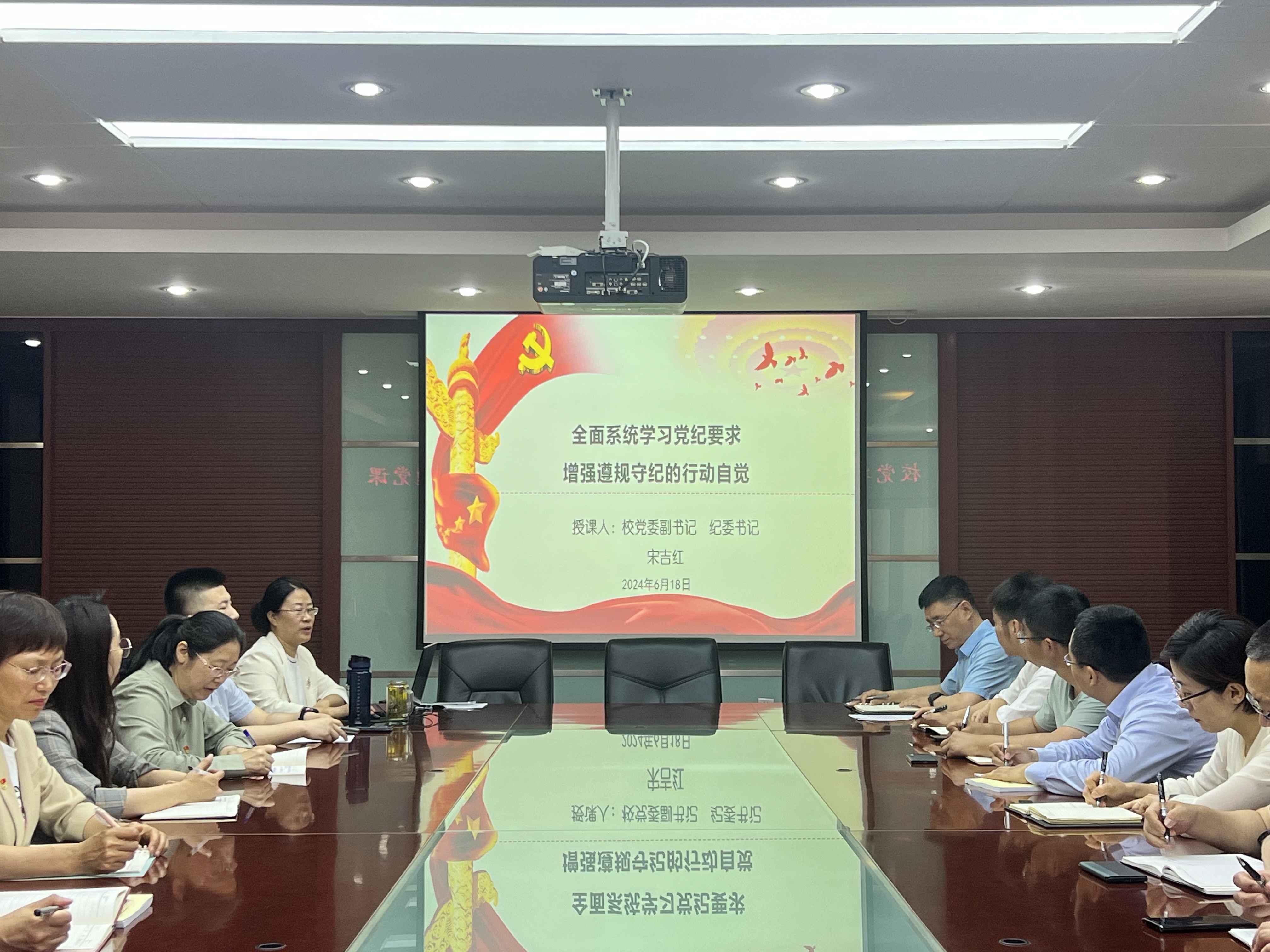 6月20日上午,学校党委理论学习中心组在综合办公楼808会议室举行2024年第十四次集中学习会,专题学习习近平总书记关于全面加强党的纪律建设的重要论述。会议由党委书记张志坤主持。学习会上,党委副书记陈文慧领学了中央党的建设领导小组下发的《关于认真学习领会习近平总书记关于全面加强党的纪律建设的重要论述扎实开展党纪学习教育的通知》有关文件精神。她表示,我们要深刻领会习近平总书记重要论述的科学内涵和实践要求,....